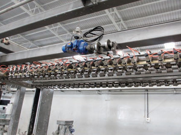 當(dāng)澆注預(yù)養(yǎng)好的模坯在空中翻轉(zhuǎn)90°吊至切割小車,脫去??蚝螅梢徊壳懈钚≤囕d運至縱切機、橫切機工位對坯體進行六面切割。首由縱切機對坯體進行縱向、水平四面切割,完成后由切割車載運坯體停留在橫切機工位,完成后經(jīng)液壓升裝置上升抬起胚體,一部切割小車退回初始位置準(zhǔn)備運載下一模胚體,以備切割。二部切割小車行至橫切機位置,液壓升裝置下降將坯體放至二部切割小車上,然后由橫切機對坯體進行垂直切割,切割完成后仍由二部切割車運載坯體運行至半成品吊具下方,由半成品吊具將坯體吊到蒸養(yǎng)車上做預(yù)編組。切割周期約4. 5min.